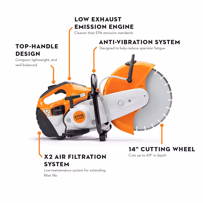 The TS 420 is so popular, it could possibly be called “the standard” to which other cut-off machines are compared. Users like it because it is compact, lightweight, reliable, and proves itself day in and day out, all day long. The TS 420 features all the high-performance features of the TS 410 —including an X2 air filtration system for a clean and smooth-running engine and virtually maintenance-free filters. With the added benefit of a 14” cutting wheel, it will handle cuts up to 4.9 inches in depth. This cut-off machine backs up its larger cutting capacity with a ton of usability features.